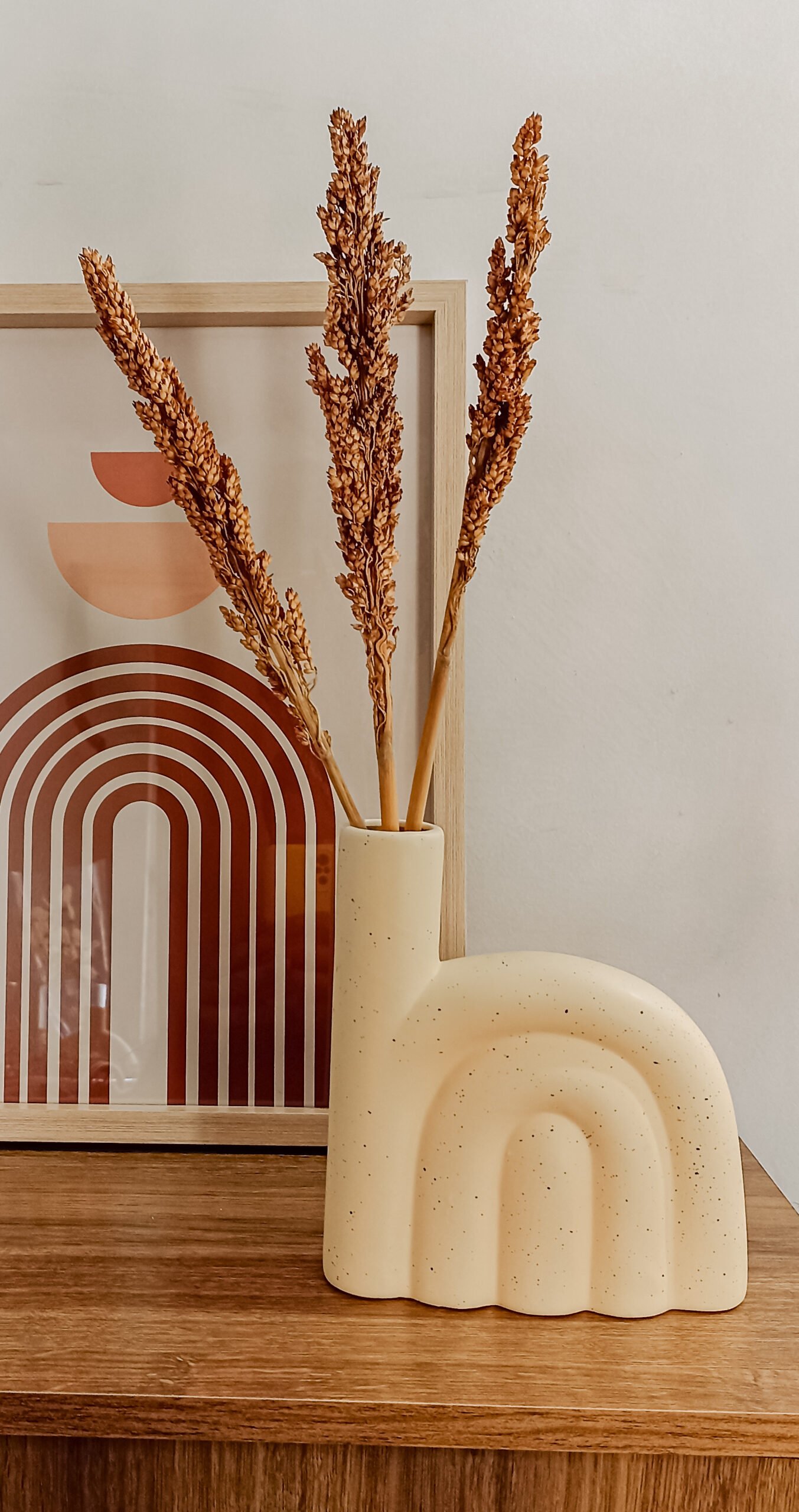 O vaso Arcos e o lindo sorgo natural desidratado vai trazer um toque divertido e moderno para sua decoração.